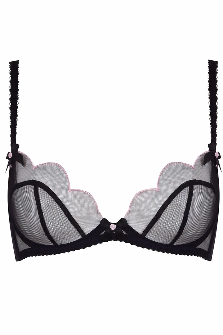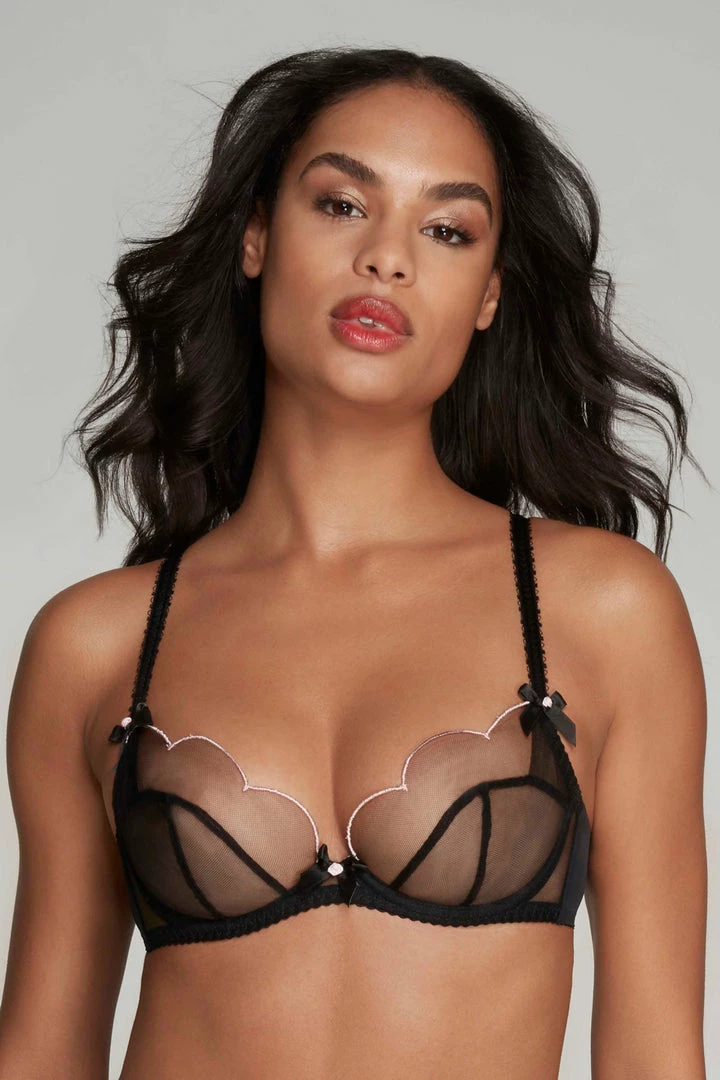 Indulge yourself with the iconic Lorna black bra from Agent Provocateur. This effortlessly elegant plunge bra is a must-have staple for your designer lingerie wardrobe, featuring three-part cups for support. The Austrian embroidery and French seam detailing adds a girlish twist, perfect for taking you from day to night. Complete the look with the Lorna Brief and Suspender Belt for an added wow factor.