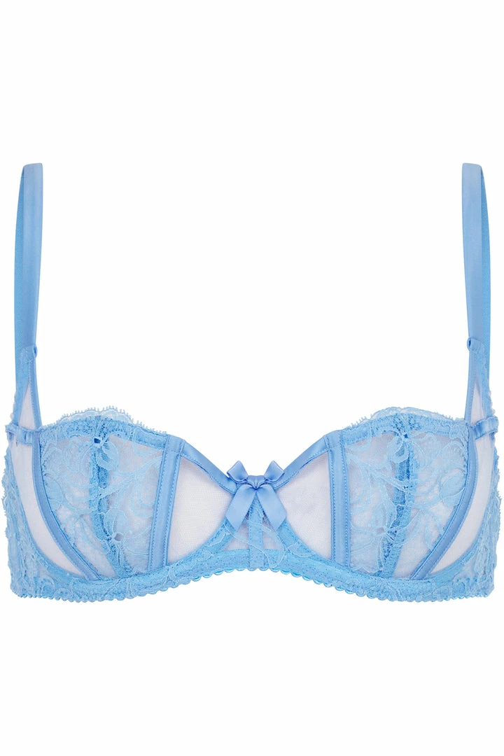 Adorn your bust with the finest French Leavers lace in the Rozlyn bra by Agent Provocateur. This underwired balconette bra features supportive vertical seaming, overlaid with satin to match the satin-wrapped shoulder straps. The cups and band are made from alternating panels of soft, sheer tulle and scalloped lace, and a ribbon bow adorns the centre. Pair it with the Rozlyn brief for everyday elegance, or the Rozlyn ouvert in the boudoir.