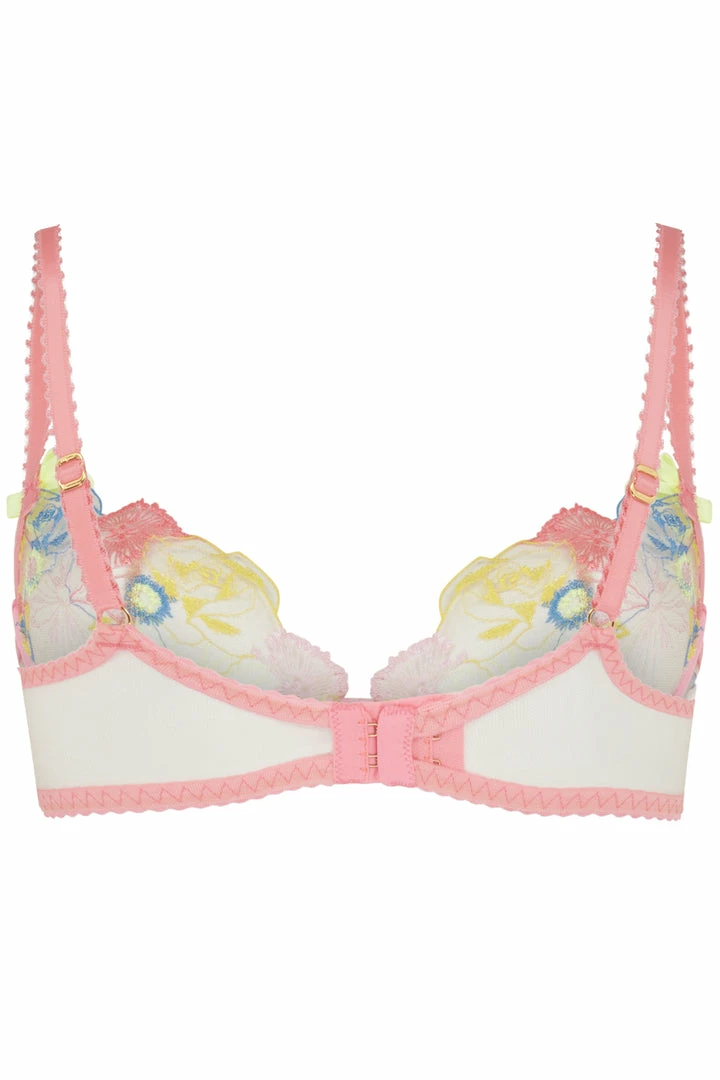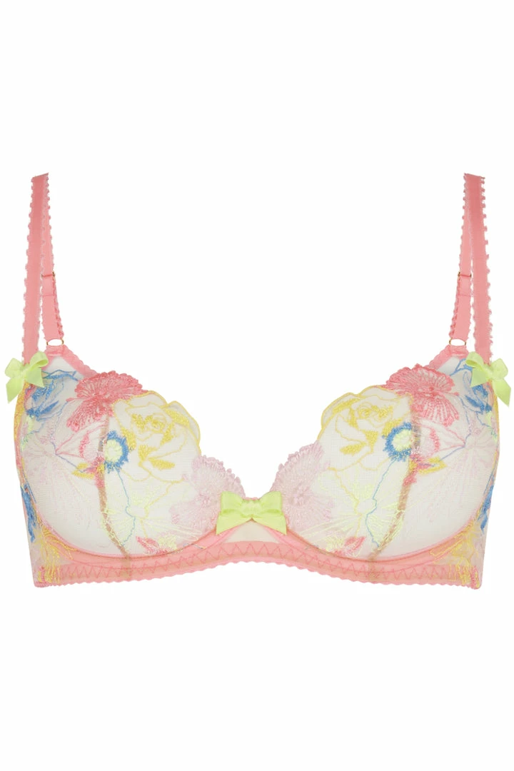 Invoke uncompromised glamour with Zuri. Agent Provocateur has taken a lingerie classic – an embroidered plunge bra – and given it a glamorous, girly twist. Austrian embroidered pastel coloured floral motifs adore the cups and wings for a luxurious and eye-catching lustre. The underwired cups feature bust darts for support and are semi-sheer. Satin bows sit on the shoulder straps and centre front for added allure. Pair yours with the matching Zuri brief and suspender belt for full-on feminine glamour.