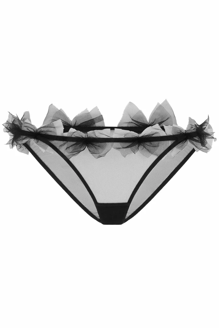 Discover the irresistible Fawn black brief from Agent Provocateur. This sensual brief is crafted from semi-sheer tulle net with 3D tulle bows for a mesmerizing effect. Wear yours with the matching Plunge Underwired Bra and Suspender Belt for an added wow factor.
