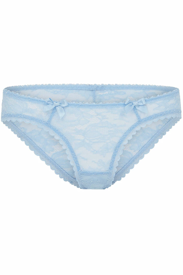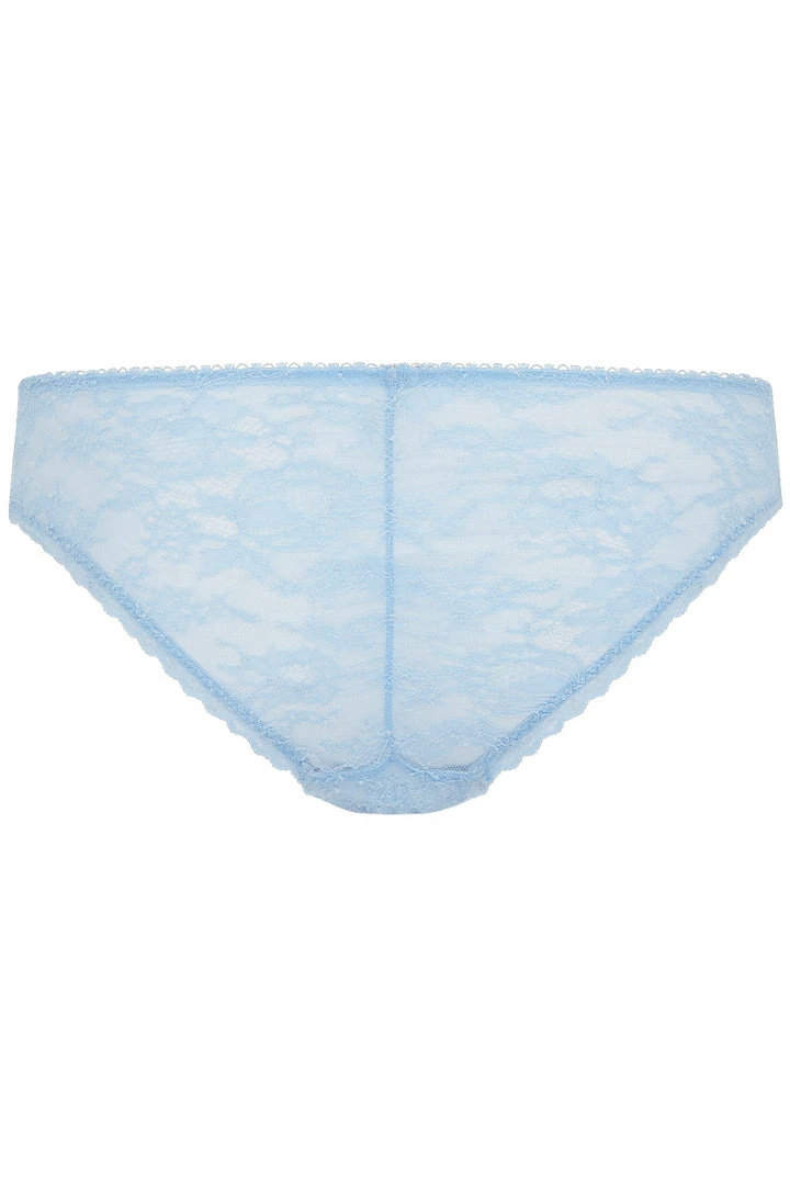 Crafted with stretch French Leavers lace in baby blue, the Hinda brief features a low rise fit with narrow sides and a cheeky cut. In the mood for something a little more risqué? Take a look at the Hinda ouvert. Whichever you choose, complete the look with the Hinda Plunge Bra and Suspender Belt.