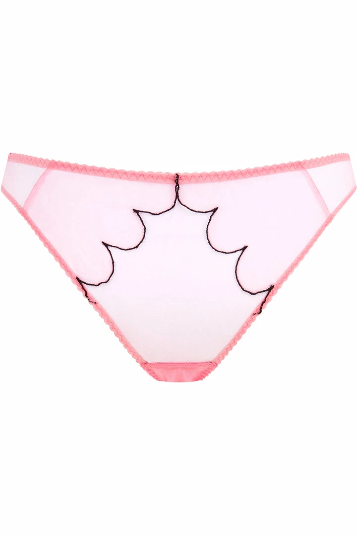 Indulge in the irresistible Lorna brief in a limited edition baby pink and black colourway from Agent Provocateur. This sheer brief is crafted from a baby pink tulle net with Austrian embroidery and black French seam detailing for a chic look. Pair yours with the Lorna Plunge Bra and Suspender Belt for a luxurious three-piece set.