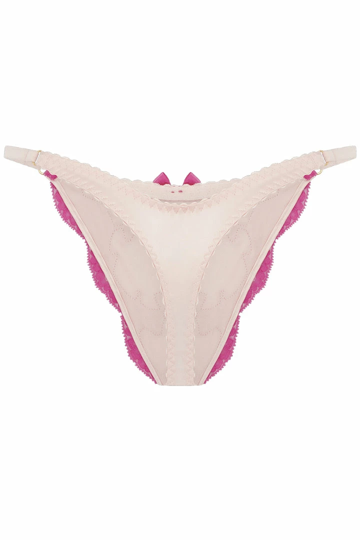 Molly is a sophisticated, timeless AP classic. Made from pink silk-satin that feels soft against the skin, the Molly thong is adorned with hand-cut Leavers lace laid over the leg line. The thin side straps attach with glistening gold-plated rings for a luxe touch. Wear this irresistible thong with the matching Molly Plunge Bra and Suspender Belt to make a statement.