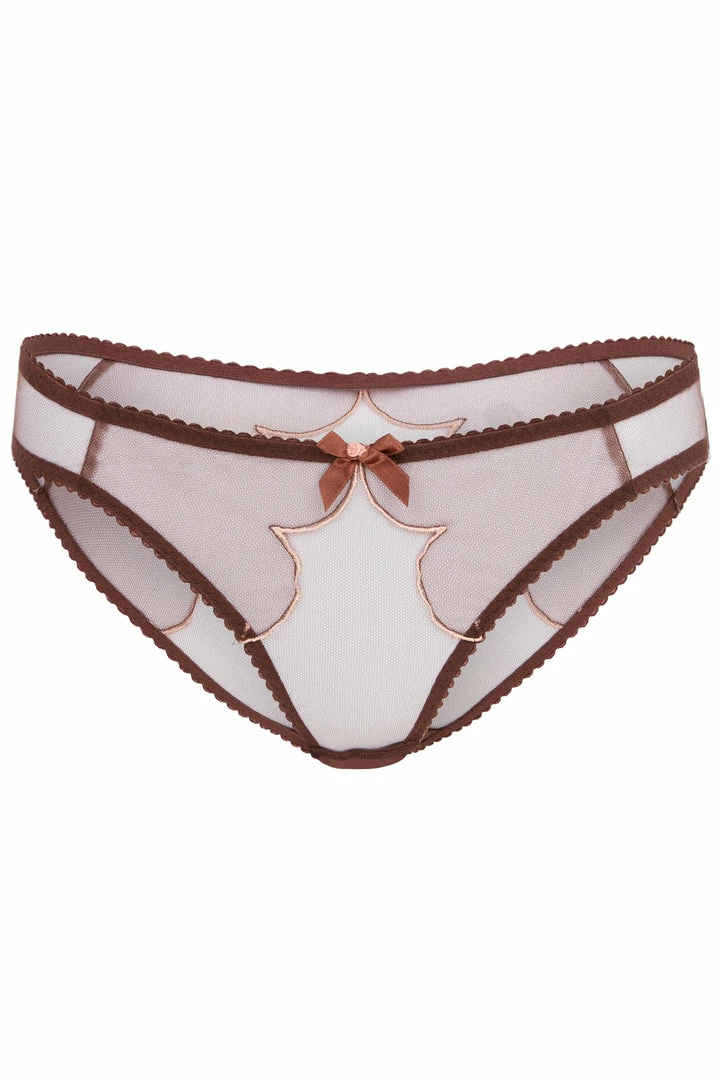 Discover the irresistible Lorna chestnut brief from Agent Provocateur. This sensual brief is crafted from sheer tulle net with Austrian embroidery and French seam detailing for a mesmerizing effect. Pair your’s with the Lorna Plunge Bra and Suspender Belt to set the tone for the day and the night that follows.
