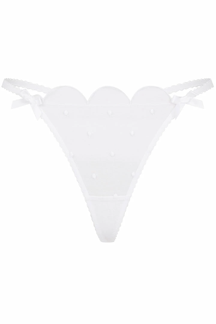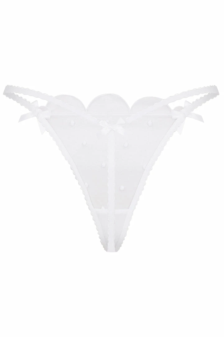 - Swiss embroidery in scalloped design adorns front of thong.