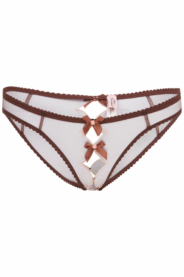 Playful and provocative indulge in the Lorna ouvert brief from Agent Provocateur. Crafted from sheer tulle in a chestnut colour, this sensually brief features beautiful Austrian embroidery and French seam detailing. The playful scalloped design creates a naughty open gusset. Wear with the Lorna Plunge Bra and Suspender Belt for a fierce lingerie look.