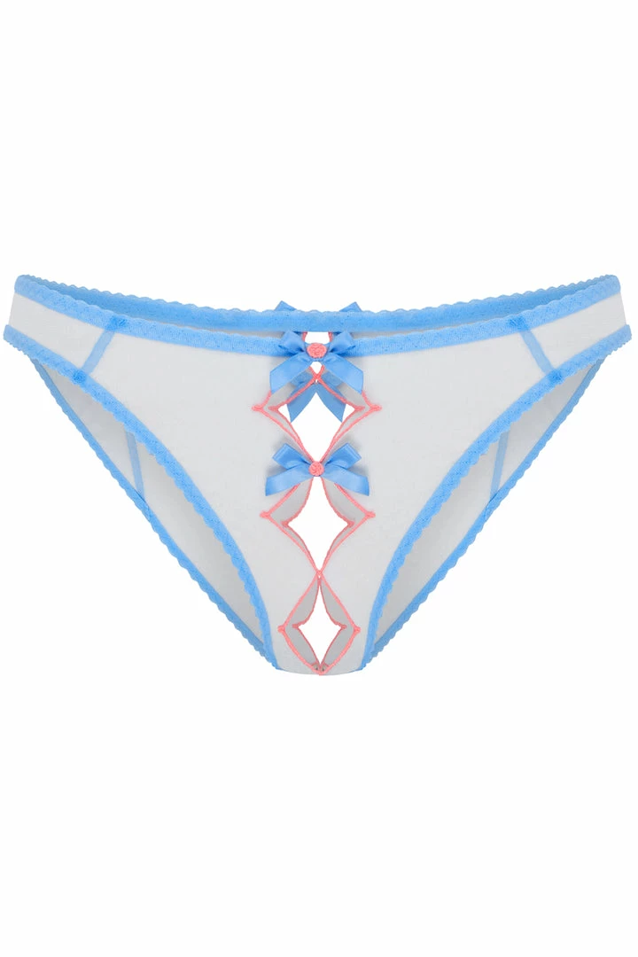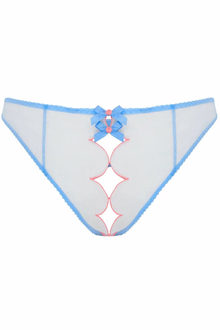 Playful and provocative indulge in the Lorna ouvert brief from Agent Provocateur. Crafted from sheer tulle in a blue colour, this sensually brief features beautiful Austrian embroidery and French seam detailing. The playful scalloped design creates a naughty open gusset. Wear with the Lorna Plunge Bra and Suspender Belt for a fierce lingerie look.