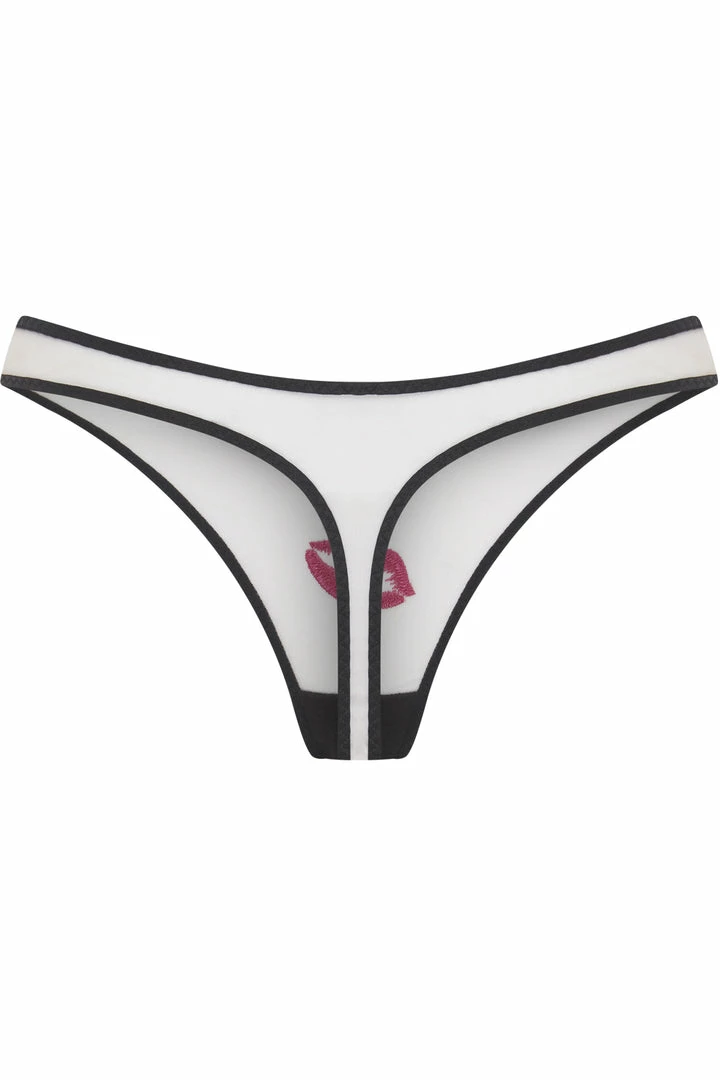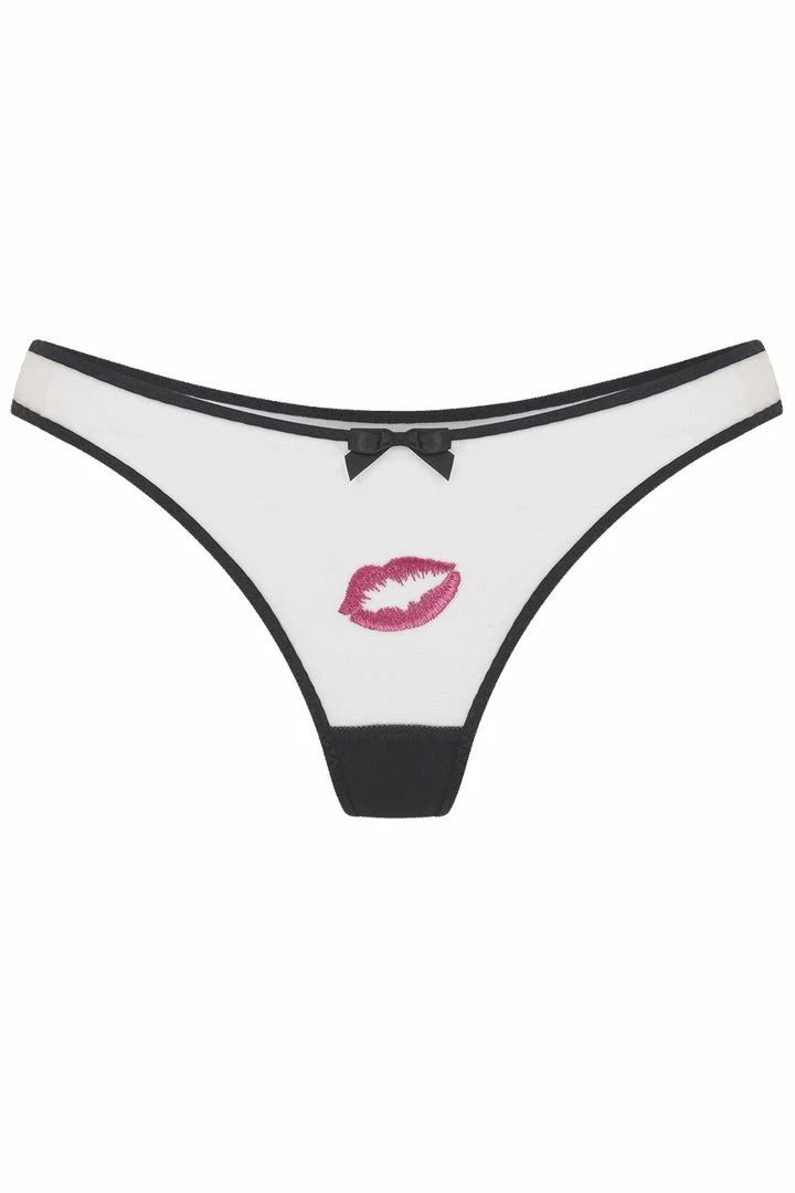 Crafted from net tulle with Fench seam detailing, the sheer Lotie Thong features a hot pink embroidery kiss and a black satin bow at the front. Cover yourself in kisses by styling this nude thong with the matching Lotie Underwired Bra.