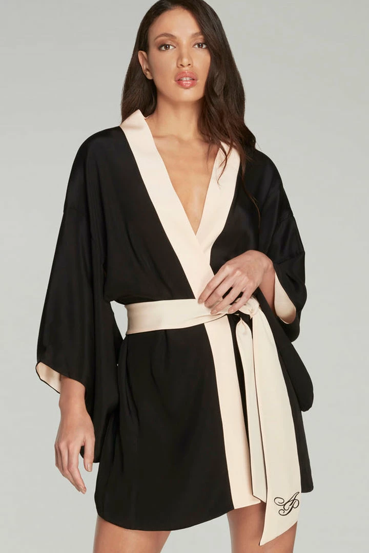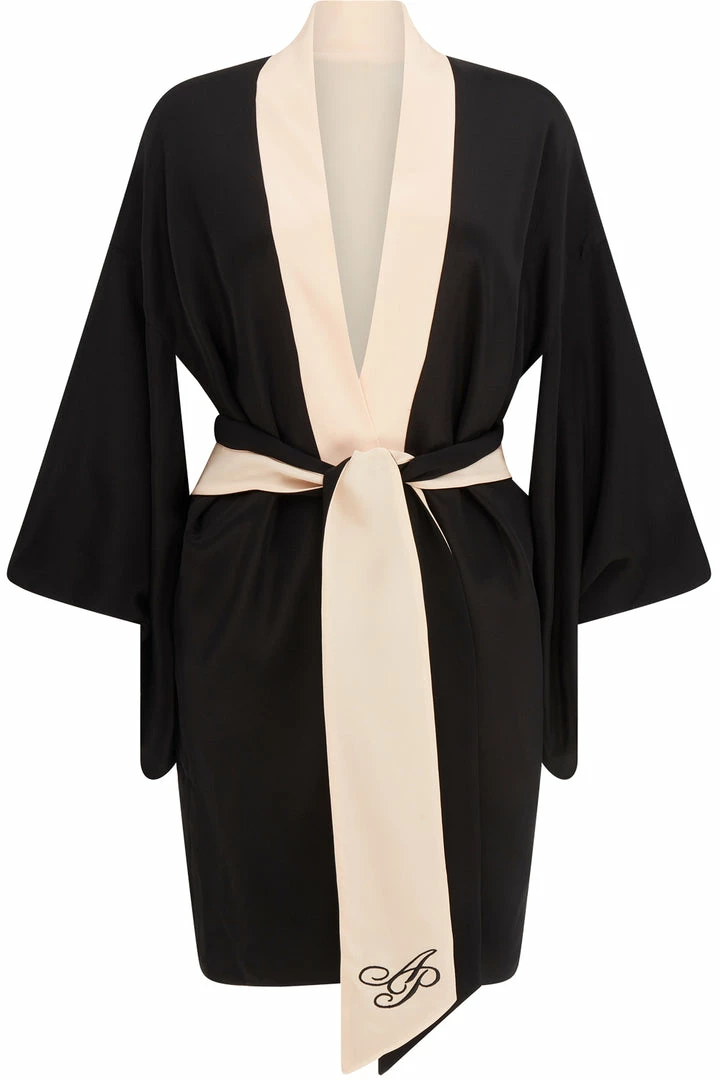 Swathe yourself in soft and slippery silk with the Kiki gown by Agent Provocateur. Exquisitely crafted from crepe silk in black, it features contrasting pale pink trims. The self-tying belt is embroidered with the brand’s signature AP monogram. Falling to the thigh, this silk dressing gown is simply perfect for lounging in glamorous style and comfort throughout the seasons. Complete the look with the Classic pink eye mask.