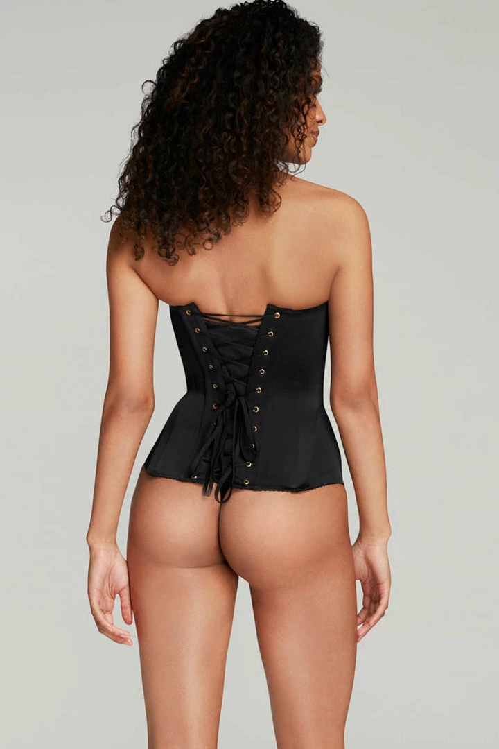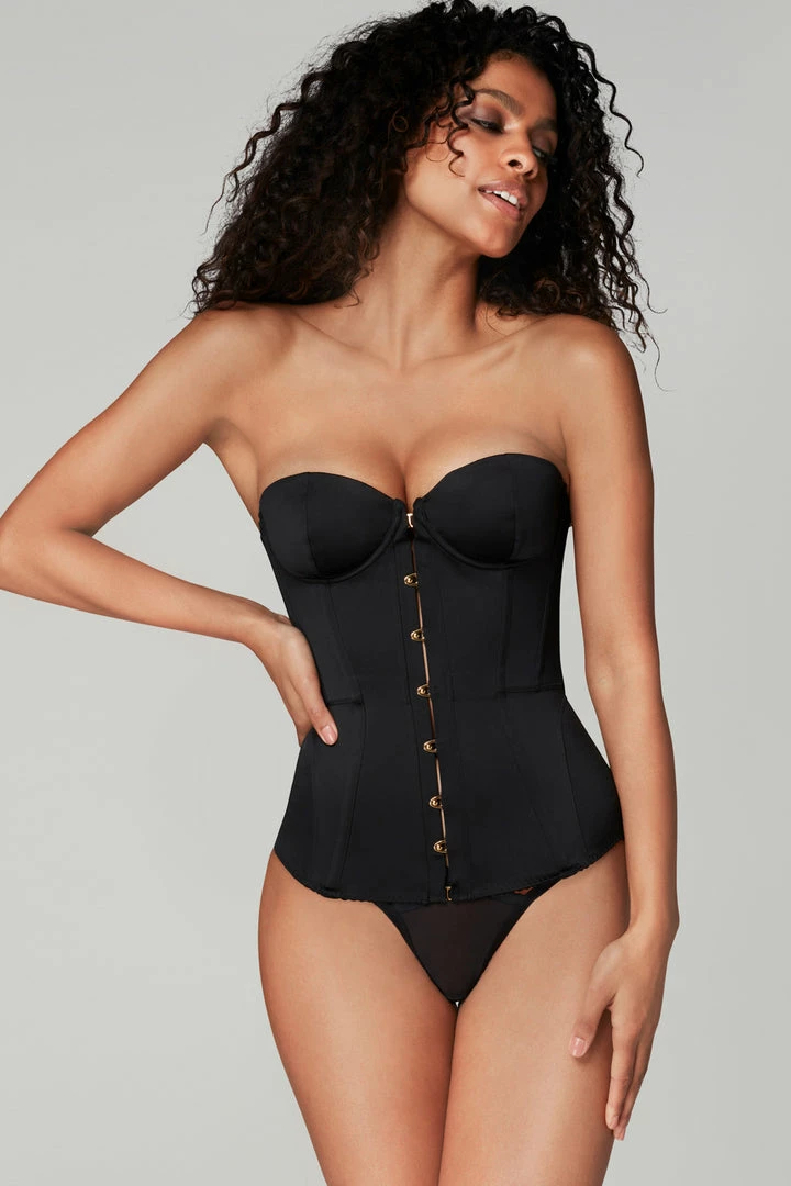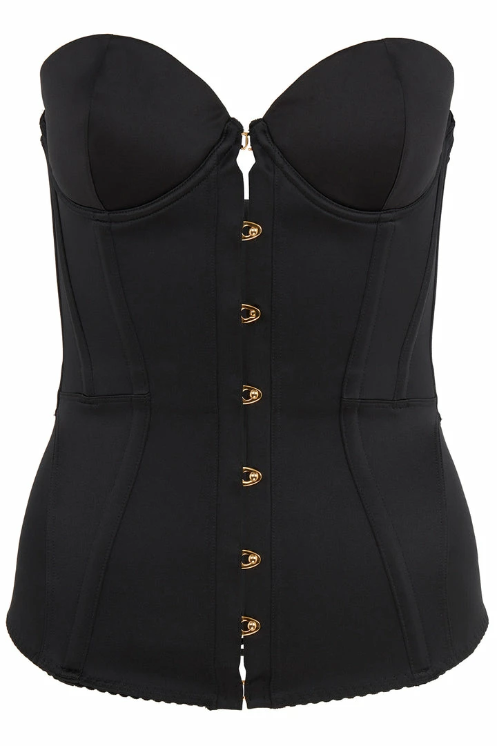Timelessly sexy and exquisitely form-finessing, Mercy is a must-have. Crafted from luxuriously soft black satin, it forms your figure with structured boning and padded, uplifting cups. The classic gold-toned busk fastening at the front allows for dressing with ease whilst traditional lacing at the back provides a personal fit. Pair yours with your favourite AP knickers or with a black pencil skirt and heels.