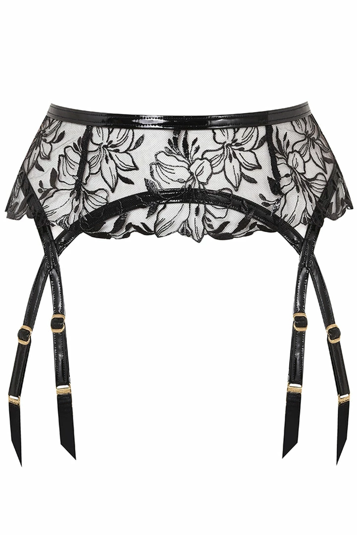 Indulge your love of beautiful lace with this sexy, black suspender belt. The sensual embroidery lace features a foiled, wetlook finish, which creates the mesmerising effect of flowers swirling across the skin. A fiercely feminine piece that will add luxury and elegance to your black lingerie collection. Style yours with the matching Ozella Brief and Plunge Bra.