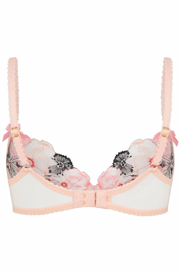 Invoke uncompromised glamour with Zuri. Agent Provocateur has taken a lingerie classic – an embroidered plunge bra – and given it a glamorous, girly twist. Austrian embroidered pastel coloured floral motifs adorn the cups and wings for a luxurious and eye-catching lustre. The underwired cups feature bust darts for support and are semi-sheer. Satin bows sit on the shoulder straps and centre front for added allure. Pair yours with the matching Zuri brief and suspender belt for full-on feminine glamour.