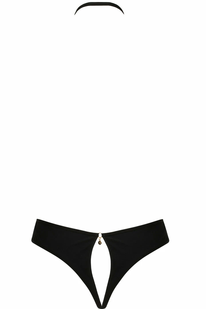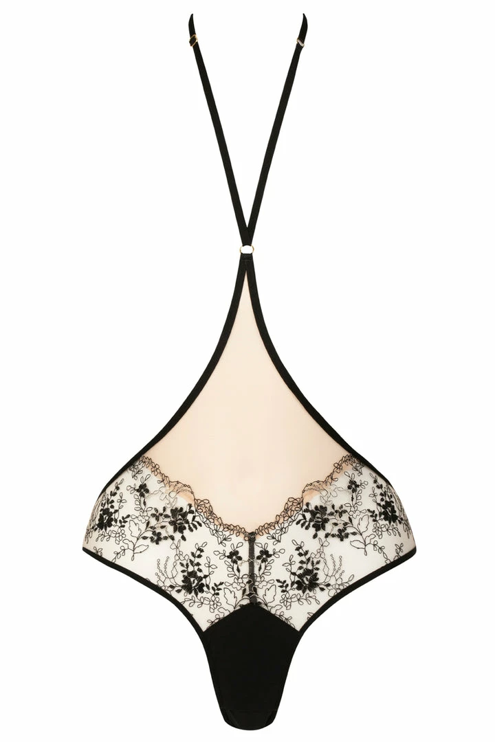 The ultra-sexy Après Minuit playsuit from Atelier Amour is crafted from a beautiful black floral embroidery with golden threads on nude mesh. The golden threads of the embroidery add a refined touch of shine to the lingerie. Style yours alone with nipple covers or complete the look with the matching half cup bra.