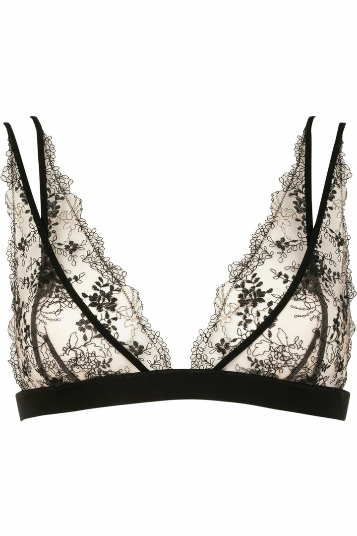Look and feel sensational in the Après Minuit wireless triangle bra by Atelier Amour. This semi-sheer bra is made from luxurious embroidery on mesh fabric for a seriously sexy look. The embroidery features golden threads that add a very refined touch of shine. The underbust band enhances your figure and the criss-cross over the breasts will allow you to show off your assets at any time. Complete this luxury lingerie look with the matching Après Minuit mini thong and suspender harness.