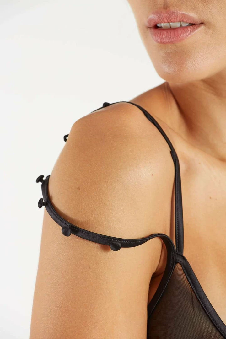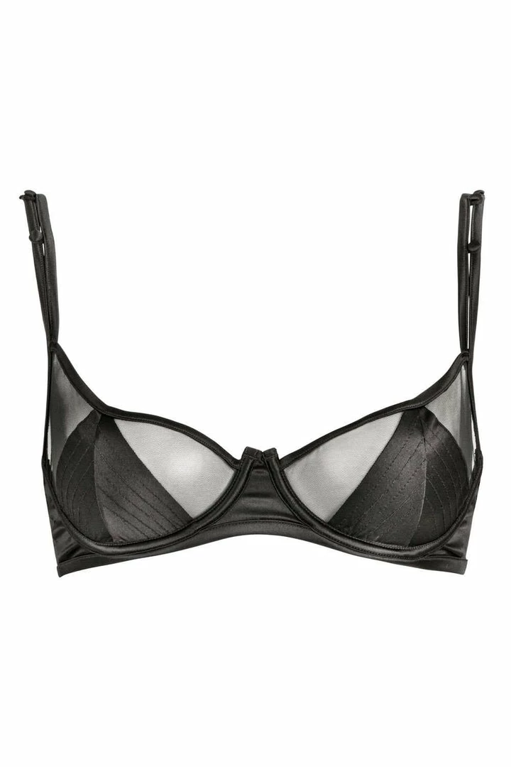 French lingerie from Atelier Amour. Highlight the natural curves of your breasts with the elegant Douce Insomnie underwired wire bra. The bra is adorned with shiny satin and soft tulle. The cups feature topstitched satin to draw attention to your best assets for an elegant and sensuous appeal.