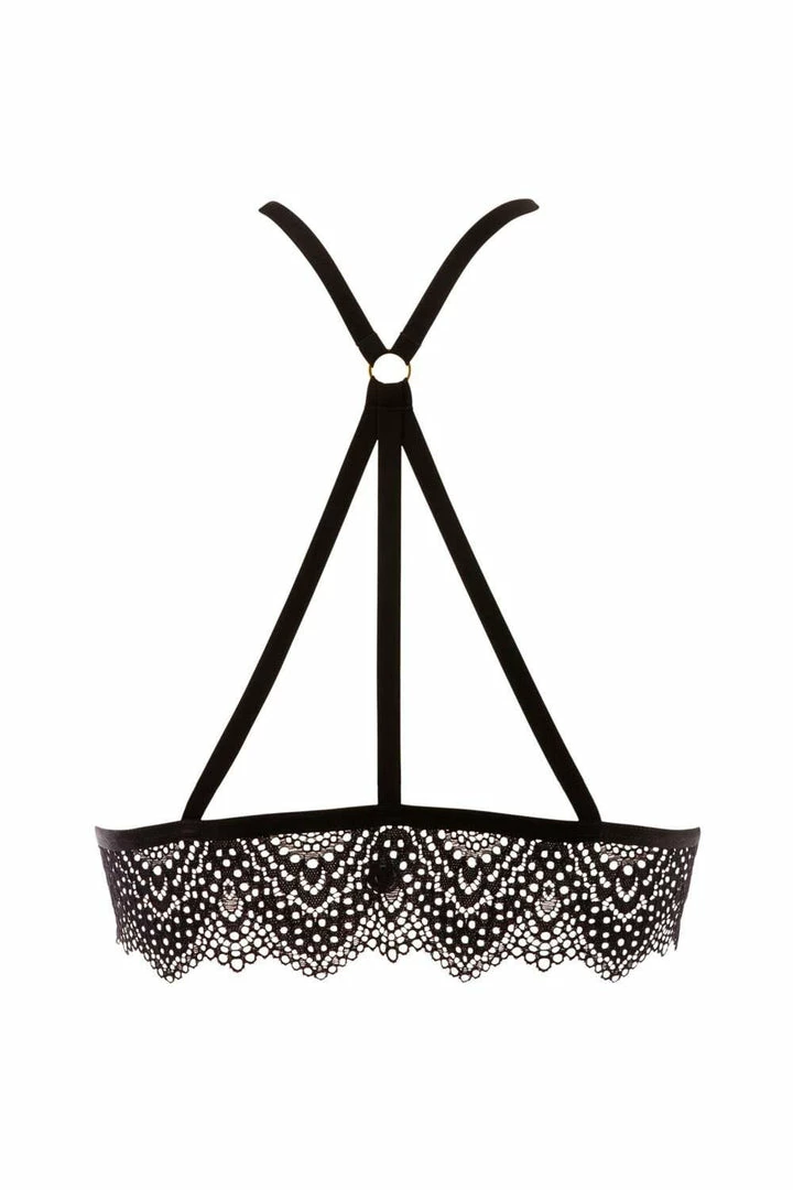 Nothing looks as alluring as sheer lingerie. The Nommée Désir triangle bra is an exceptionally beautiful design with a front fastening closure it’s free from padding and wires for a lightweight feel and natural cleavage. The combination of transparent black mesh and with graphic lace is sure to turn heads and charm your beloved!