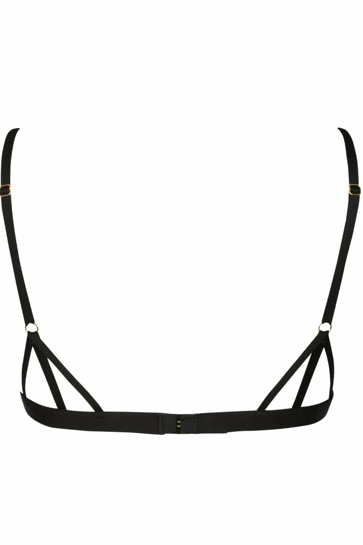 Look and feel sensational in the Onde Sensuelle ouvert triangle bra by Atelier Amour. This semi-sheer bra is crafted from soft cross-cut graphic black lace for a seriously sexy look. The underband is adorned with a golden chain jewel for added a touch of shine. Complete this black erotic lingerie look with the matching Onde Sensuelle open brief and suspender harness.