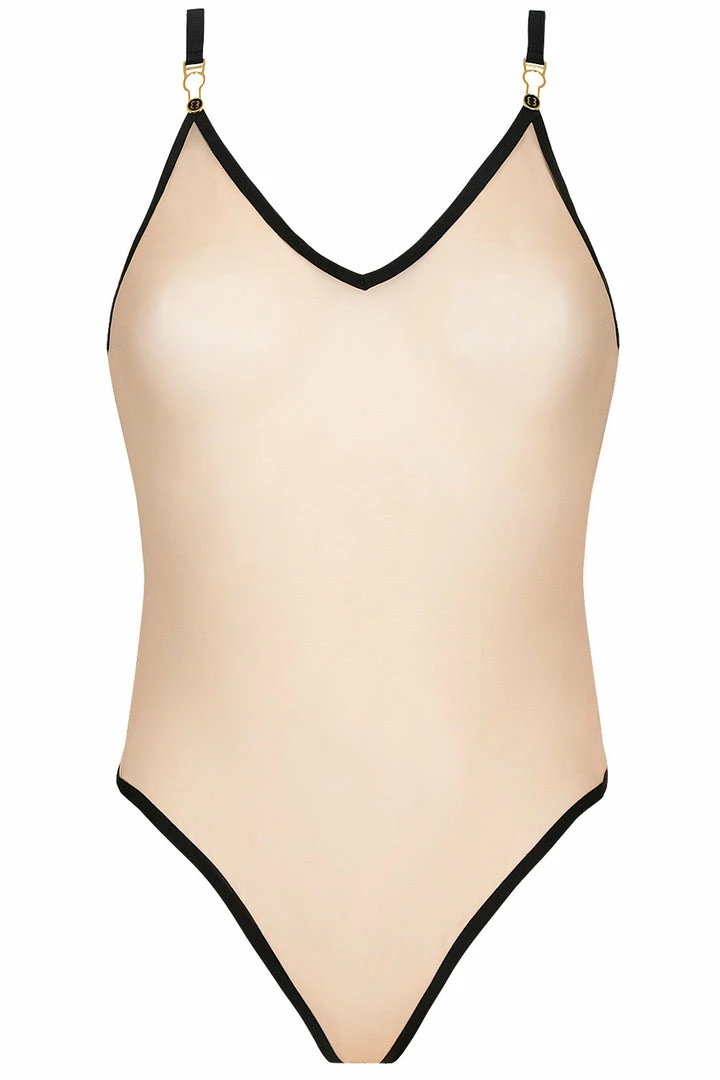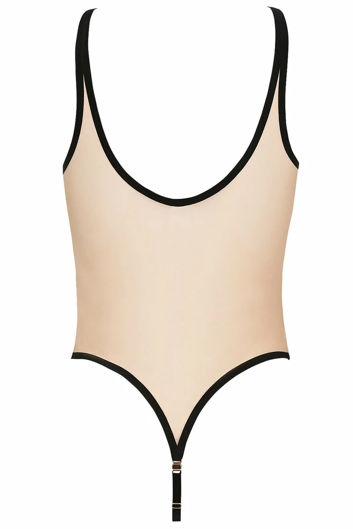 Cut from nude transparent tulle with black elastic straps, this risque bodysuit from Atelier Amour’s ‘Insoutenable Légèreté’ collection beautifully showcases the female body. Each shoulder strap is decorated with a golden clip to invite love games and body exploration. To the back, a small magnet allows the bodysuit to be openable to the crotch in a single gesture. Style yours with sheer hold-ups for a captivating look.