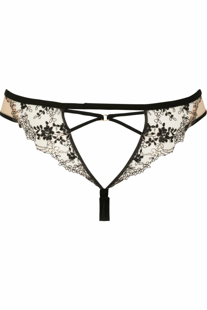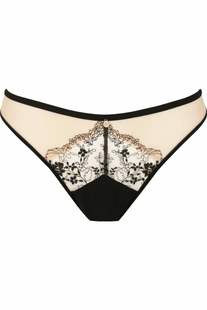 Cut from beautiful embroidery and mesh the Après Minuit tanga provides a wider cut at the back and sides than a classic thong for a discreet, sexy effect. The golden threads of the embroidery and its accessories give a very refined touch of shine to this luxury lingerie piece. Complete the look with the matching Après Minuit underwired bra and suspender harness.