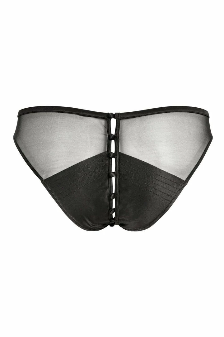 Satin lingerie from Atelier Amour. Discover the Douce Insomnie Openable Brief adorned with soft transparent tulle and silky satin with playful buttons that have to be patiently undone to reach the prize… These open panties are a little jewel of mischief and refinement.