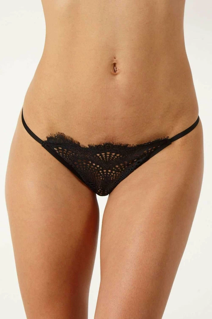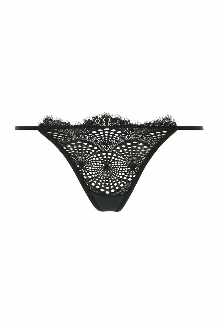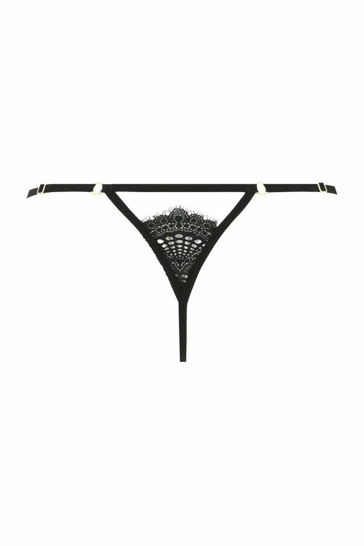 French lingerie from Atelier Amour. A panty pleasurer for the eyes… The mini thong from the Madame Rêve collection features soft elegant black lace, adjustable straps and a tempting cut out to back highlighting your best ‘ass’ets. Style with black hold ups and the matching half cup bra or cupless bra for a naughty night in.