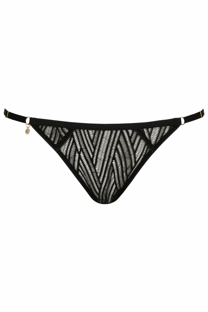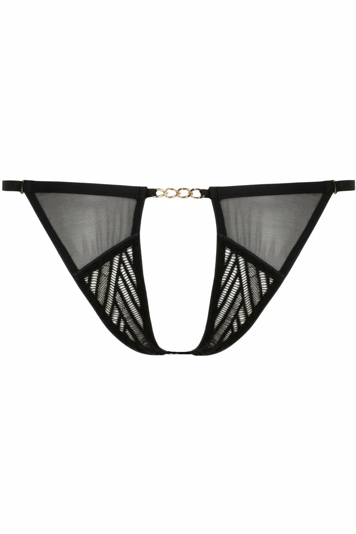 Turn up the heat in this captivating open brief by Atelier Amour. Cut from graphic lace and soft microfibre mesh in a deep black hue this ouvert brief is enhanced by golden chain at the back. Style yours with the matching open triangle bra and suspender harness for a seductive statement.