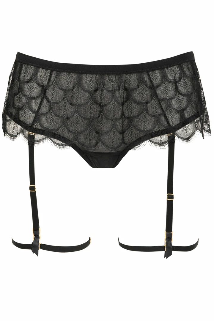 Leave very little to the imagination with this erotic ouvert brief from Atelier Amour. Part of the ‘Mystic Shadow’, the harness brief is crafted from sheer mesh and graphic lace with a tempting peekaboo cut-out back. Its unique design features four suspender straps and two leg garters which can all be adjusted or detachable depending on your mood. Style yours with the matching seamed stockings and wire bra to unleash your inner femme fatale.