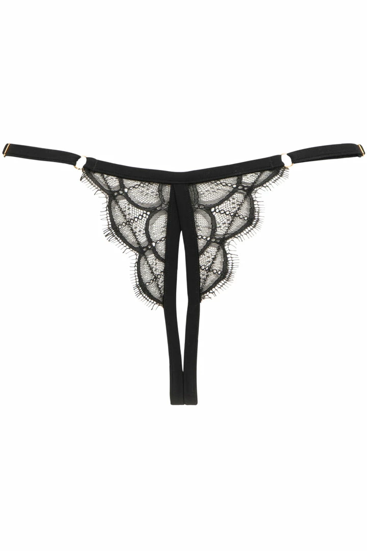 Set someone’s pulse racing in this sexy thong from Atelier Amour. Crafted from black graphic lace, this naughty open thong features a peekaboo at the gusset. The adjustable elastic waistband and sides are covered with velvety soft crepe for more softness. Pair it with one of the matching Mystic Shadow bra’s for a night to remember!