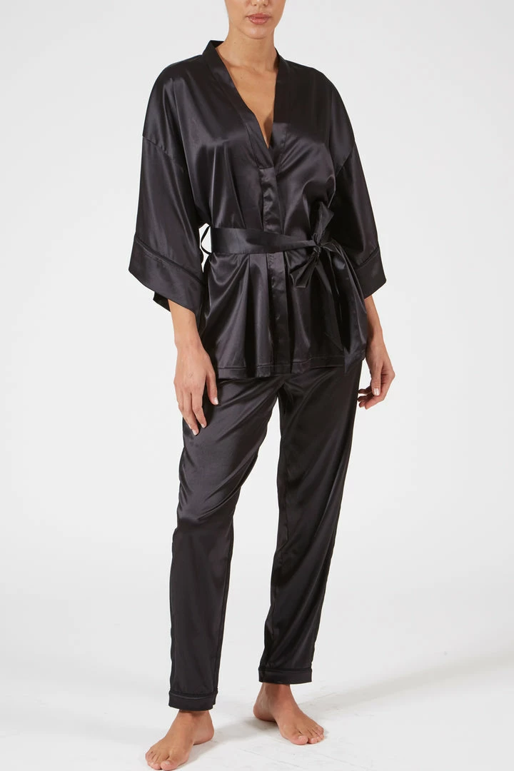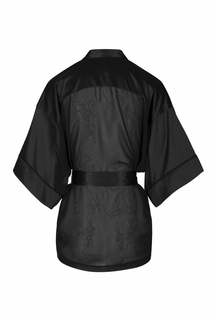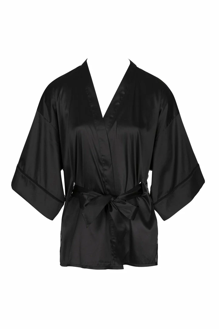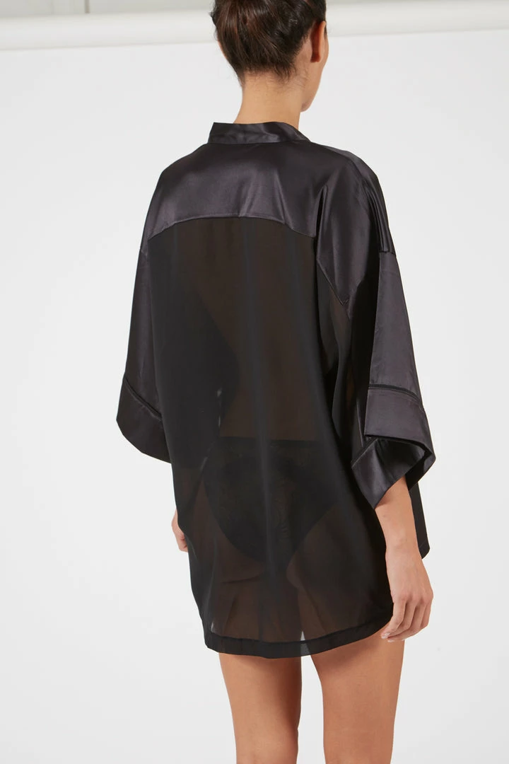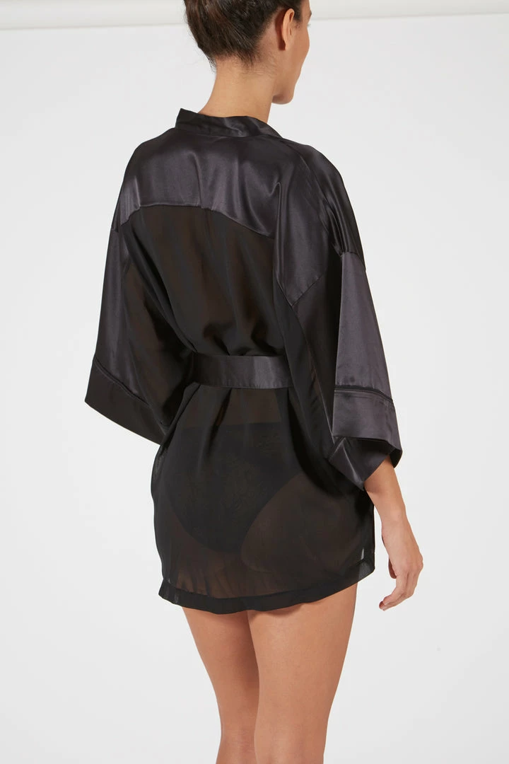 Let all your senses succumb to the charms of the Nuit à Broadway line. The Nuit à Broadway skirt combines the softness and finesse of satin with sexy transparent fabric. Buttoned to the front, it has beautifully draped kimono sleeves and a ribbon tie which can be removable depending on your mood. The transparent fabric to the back shows a glimpse of the skin for an irresistible lounge look.