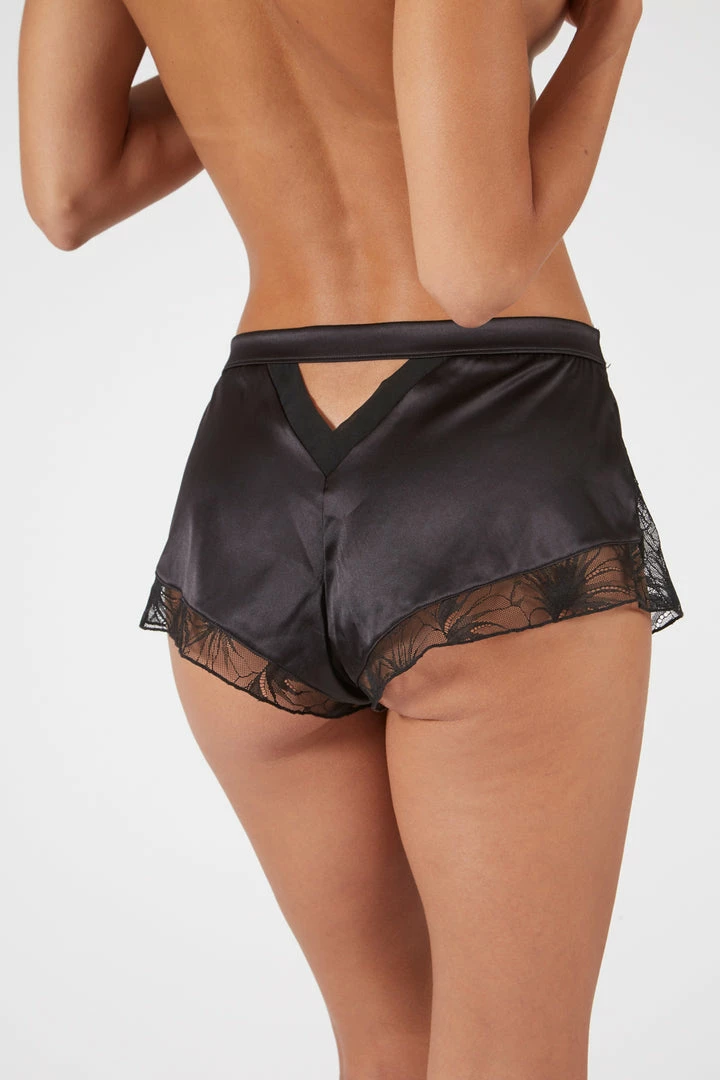 Let all your senses succumb to the charms of the Nuit à Broadway line. Crafted from soft black satin the Nuit à Broadway shorty is sexy and comfortable at the same time! Elasticated at the waist to offer unparalleled comfort they feature a pretty “V” cut out in the back with contrasting matt and shiny material. The side slits are adorned with floral lace to subtly reveal the top of your thigh for an effortlessly erotic appeal.