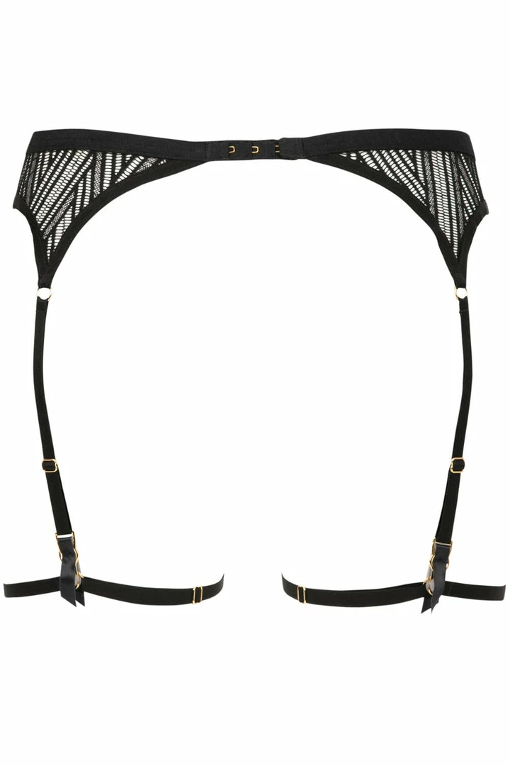Indulge yourself or that someone special with the luxurious Onde Sensuelle suspender harness from Atelier Amour. This luxury 4-strap suspender belt is crafted from graphic black lace. A gold chain jewel at the waist enhances the piece whilst elastics frame the edges and wrap around the body. The suspender straps are adjustable and the black garters are removable for your desired look. Complete this luxurious black lingerie look by wearing it with the Onde Sensuelle Open Triangle Bra and Brief.