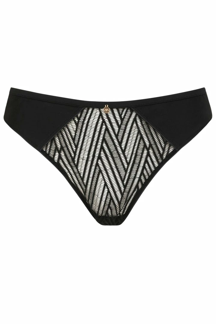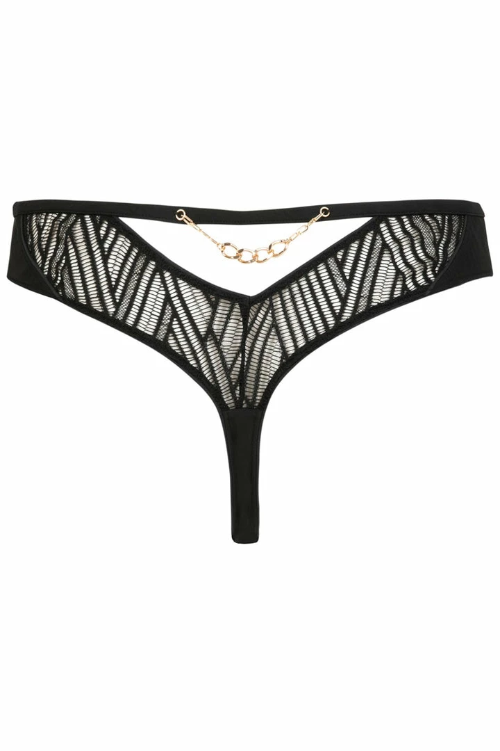 Cut from beautiful graphic lace and soft microfibre mesh, the Onde Sensuelle tanga provides a wider cut at the back and sides than a classic thong for a discreet, sexy effect. On the back, a sexy cutout and golden chain jewel enhance the hollow of your back. Complete the look with one of the matching Onde Sensuelle wire bra and two piece kit.