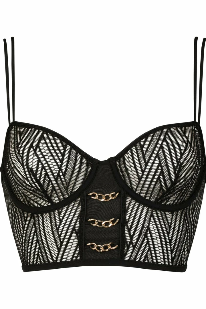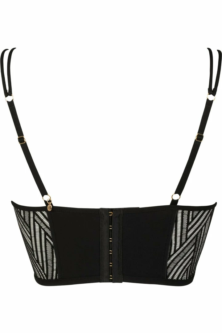 Indulge your love of French lingerie with the irresistible black bustier from Atelier Amour’s Onde Sensuelle collection. This sexy longline bra is crafted from a beautiful and sensual mix of black graphic lace and microfibre mesh. The front is enhanced by three gold chain jewels for a hint of sparkle. The thin double shoulder strap and back are adjustable for your desired fit. Pair it with the Onde Sensuelle tanga for everyday elegance, or the ouvert brief in the boudoir.