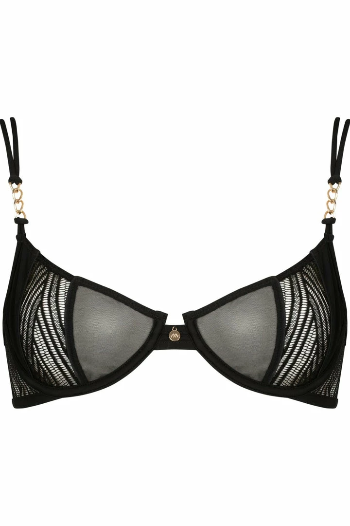 Adorn your bust with the finest fabric in the Onde Sensuelle bra by Atelier Amour. This underwired half cup bra features a beautiful and sensual mix of black graphic lace, sheer mesh and microfibre. The shoulder strap are adorned with gold chain jewellery for a touch of glamour.Pair it with the Onde Sensuelle tanga for everyday elegance, or the ouvert brief in the boudoir.