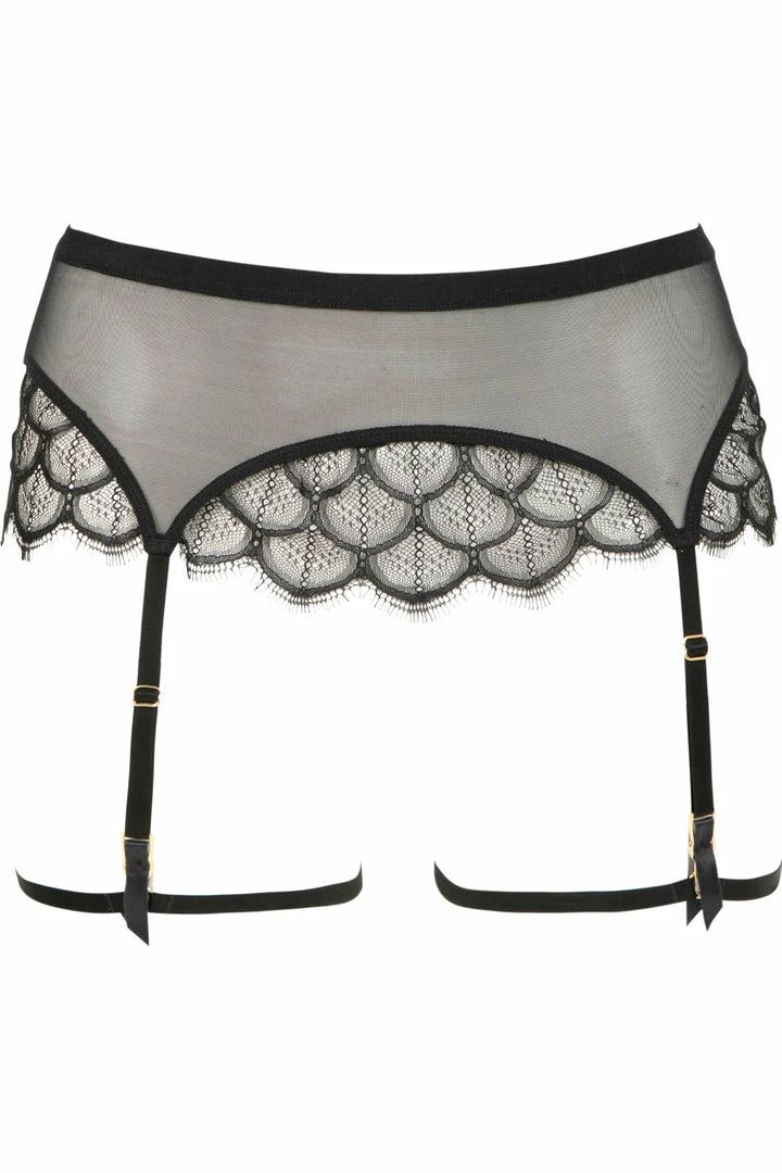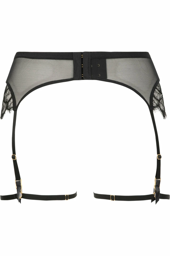 Crafted from sheer mesh and geometric lace, the sexy suspender harness from the Atelier Amour’s Mystic Shadow features 4 adjustable suspender straps and 2 detachable leg garters. Complete this luxury French lingerie set with the matching Mystic Shadow Triangle Bra & Brief.