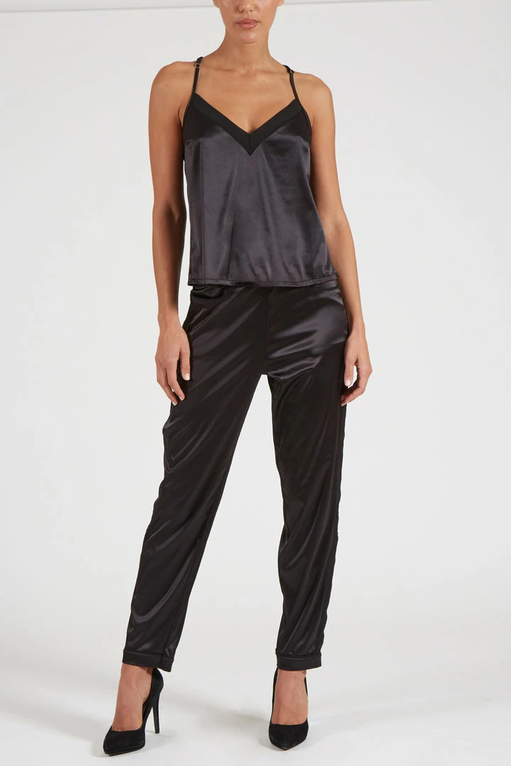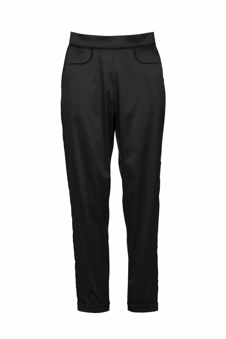 Let all your senses succumb to the charms of the Nuit à Broadway line. Crafted from shiny black satin the Nuit à Broadway pants feature a contrasting transparent matt band on the sides. In a classic cigarette shape, they have front pockets and an elasticated waistband for a snug fit. Wear yours in with the matching Nuit à Broadway item or out with chunky knitwear depending on your mood.