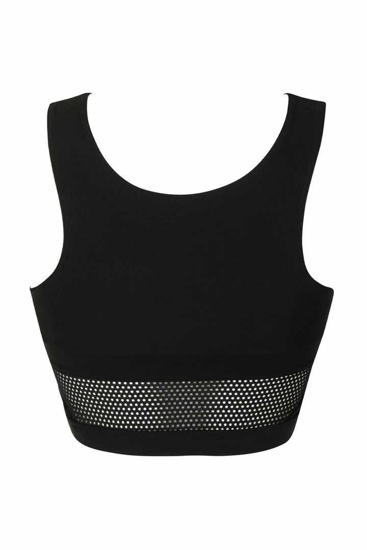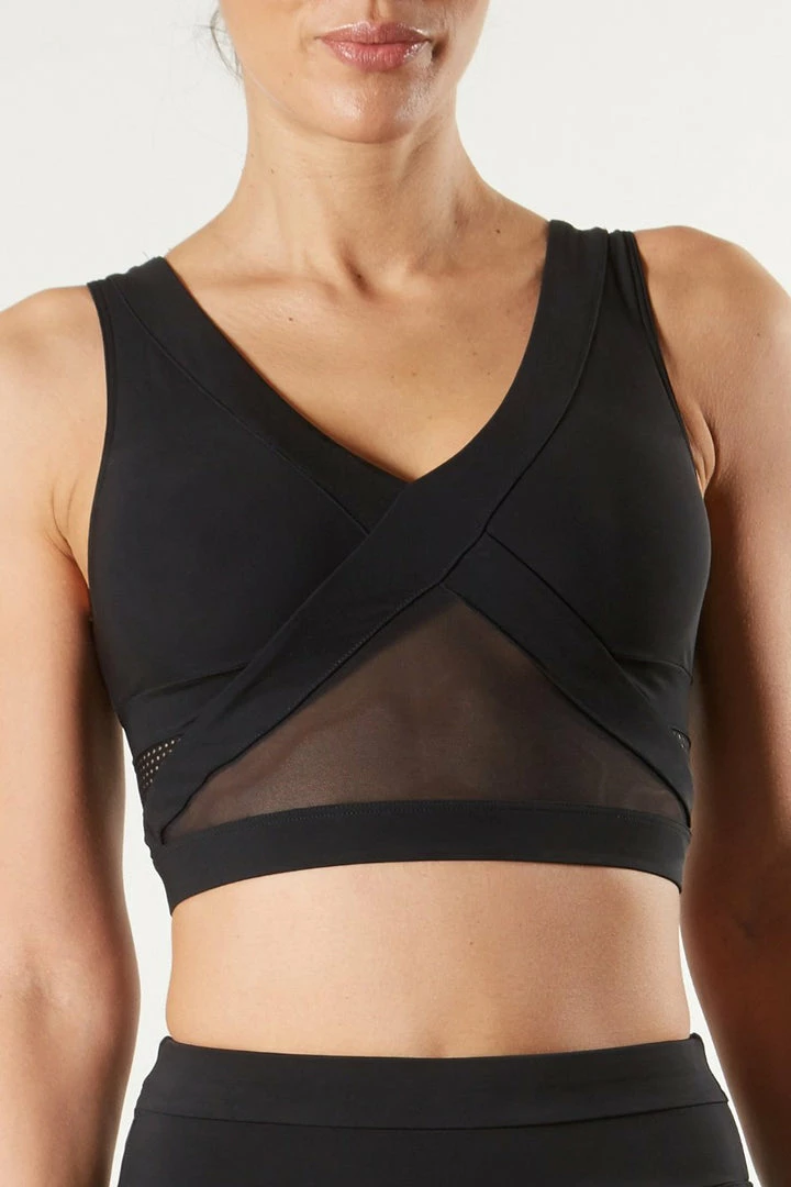 Look and feel your best in Atelier Amour’s Studio Résille sportswear collection. Crafted from a fine and soft microfiber mesh fabric to help keep you dry and comfortable throughout your workouts. This comfortable crop top features a V-shaped neckline with two crossed bands for light support. Sheer tulle highlights and the bust to the front whilst open fishnet details to the back add a sensual touch and help to keep your cool. Style yours with the matching styles from the collection.