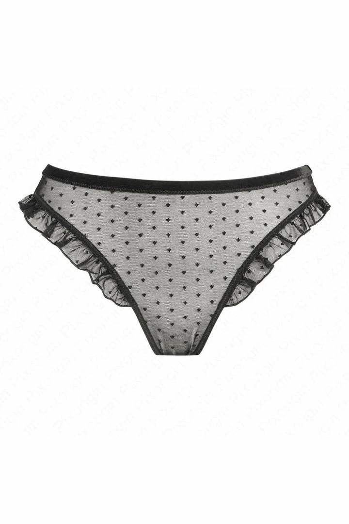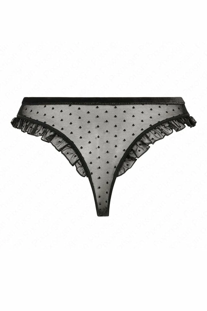 Sheer lingerie from Atelier Amour. Reveal your curves in the Plumetis Chéri collection featuring sensual sheer plumetis tulle, ruffles and velvet details. The Plumetis Chéri Tanga Thong is a stunning mix of sheer dotted and feathered tulle finished with a soft velvet waistband. Small ruffles sit to the top of the thighs and buttocks add a flirty feminine touch. Style with sheer hold-ups and the matching triangle bra for a naughty night in.