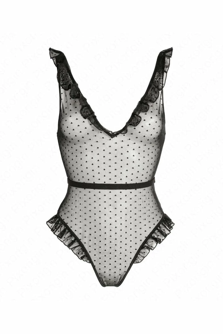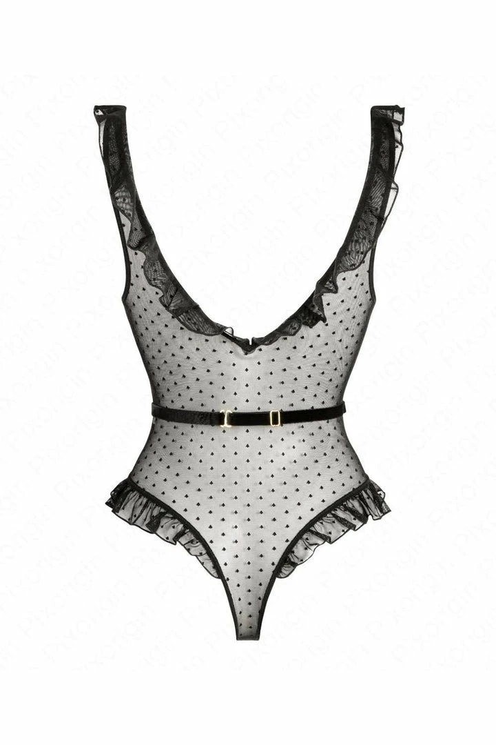 Sheer lingerie from Atelier Amour. Reveal your curves in the Plumetis Chéri collection featuring sensual sheer plumetis tulle, ruffles and velvet details. The Plumetis Chéri bodysuit features a plunging v neckline, detachable velvet belt to accentuate the waist, sexy thong brief and a high leg cut for the ultimate leg-lengthening power. Style with sheer hold-ups for a chic and sexy look.