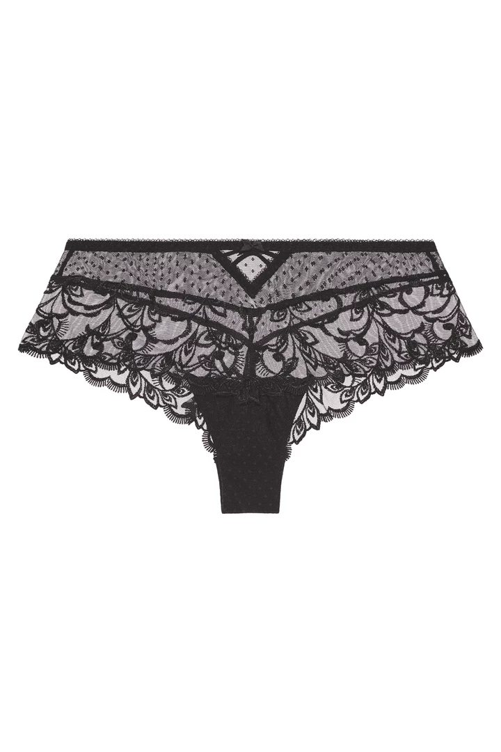 Art deco styling blends with naturalist floral motifs in this Au Bal de Flore line, tinged with romance and dreams of love. The very soft dotted tulle features cut-out scrolls, bringing complexity and sensuality to the designs. Fine spaghetti ribbons adorn the straps and the back of the briefs for a very seductive effect.