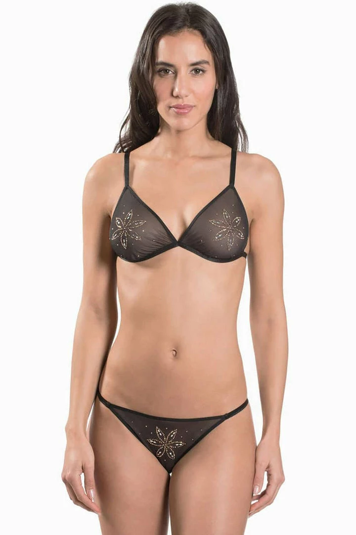 Sexy lingerie from Aubade. Introducing the Femme Star set from the Boite A Desir collection! This set is made from luxuriously soft materials and features decorative crystals for an eye-catching look. Style with black hold-ups for a chic look.