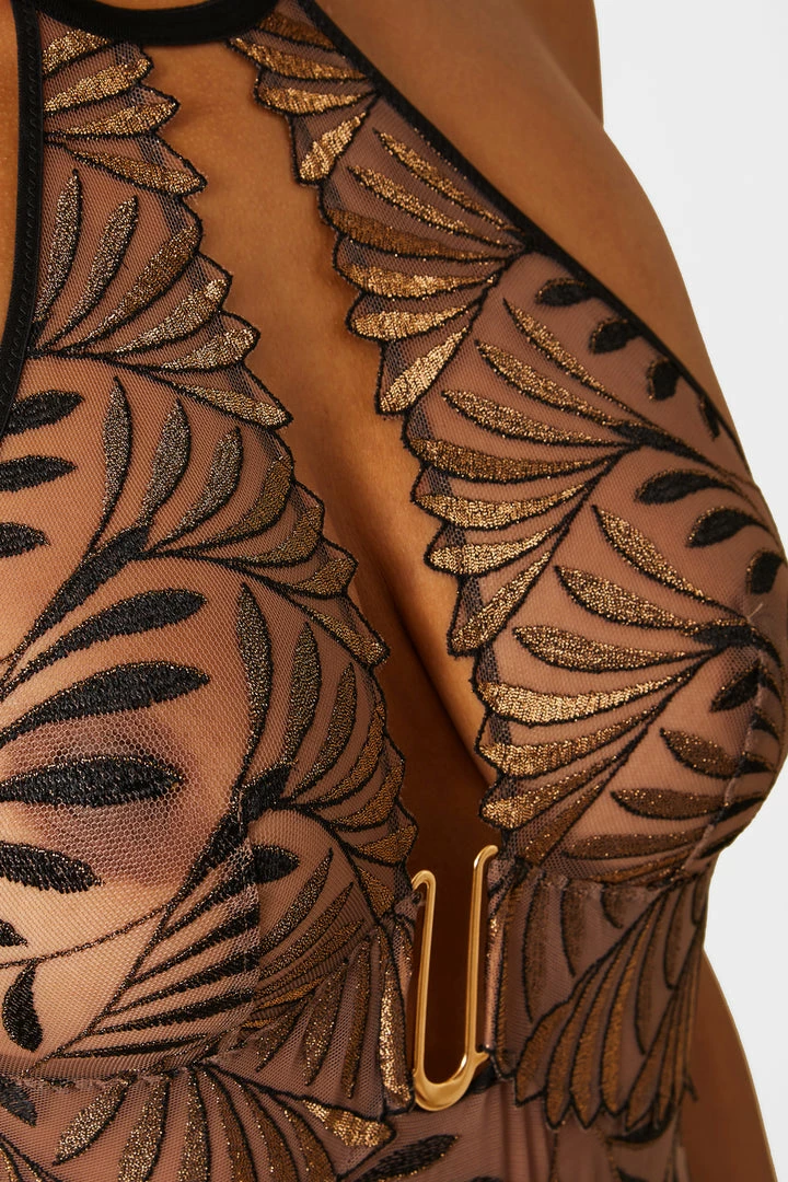 The ultimate in glamour, the Sensory Illusion Bodysuit is truly breathtaking. Made from Swiss embroidery on Lycra® tulle in a black with bronze for a bright, chic look. It traces elegant shapes onto the skin to drape your feminine figure with elegance and eroticism.