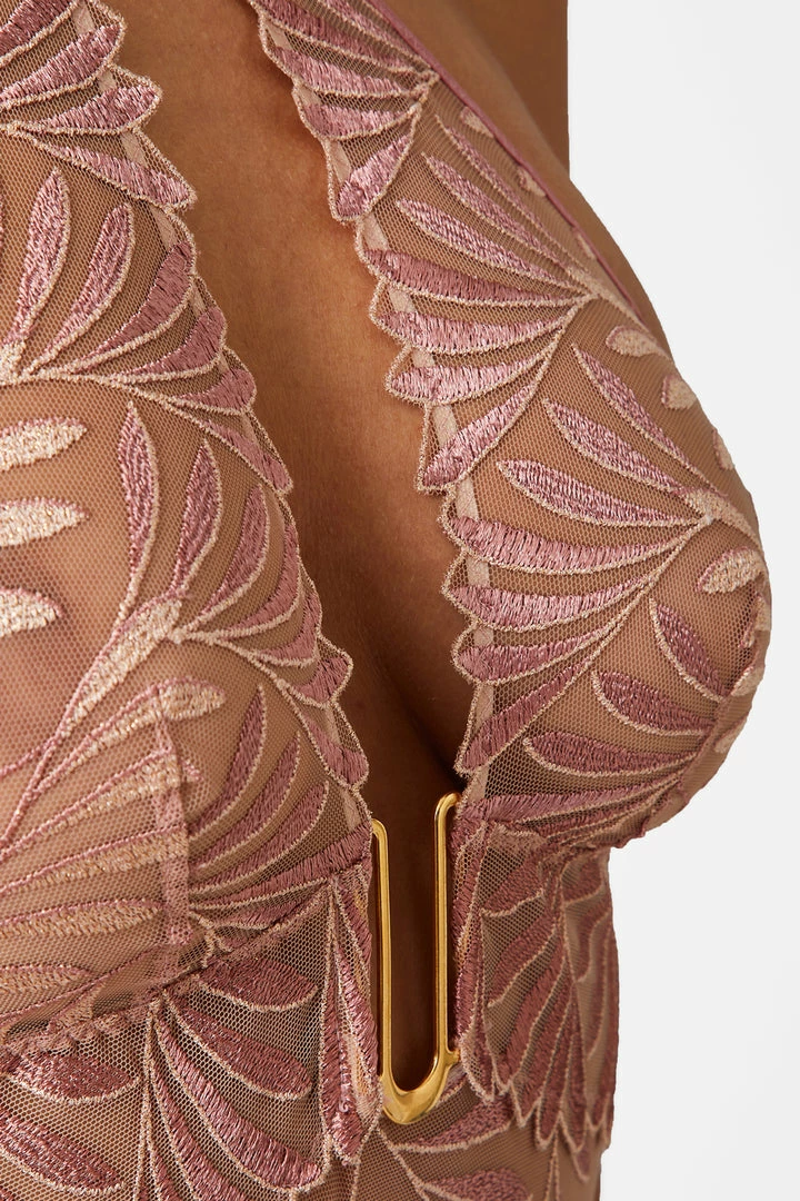 The ultimate in glamour, the Sensory Illusion Bodysuit is truly breathtaking. Made from Swiss embroidery on Lycra® tulle in a gradation from pale to antique pink for a soft, sophisticated colour. It traces elegant shapes onto the skin to drape your feminine figure with elegance and eroticism.
