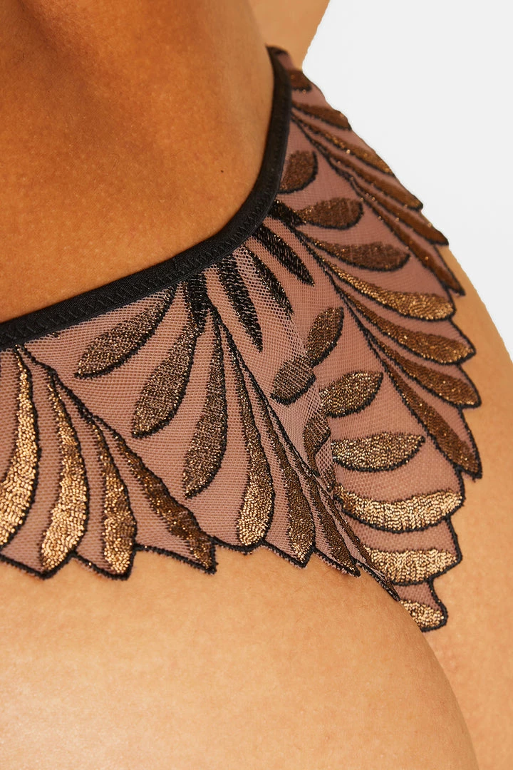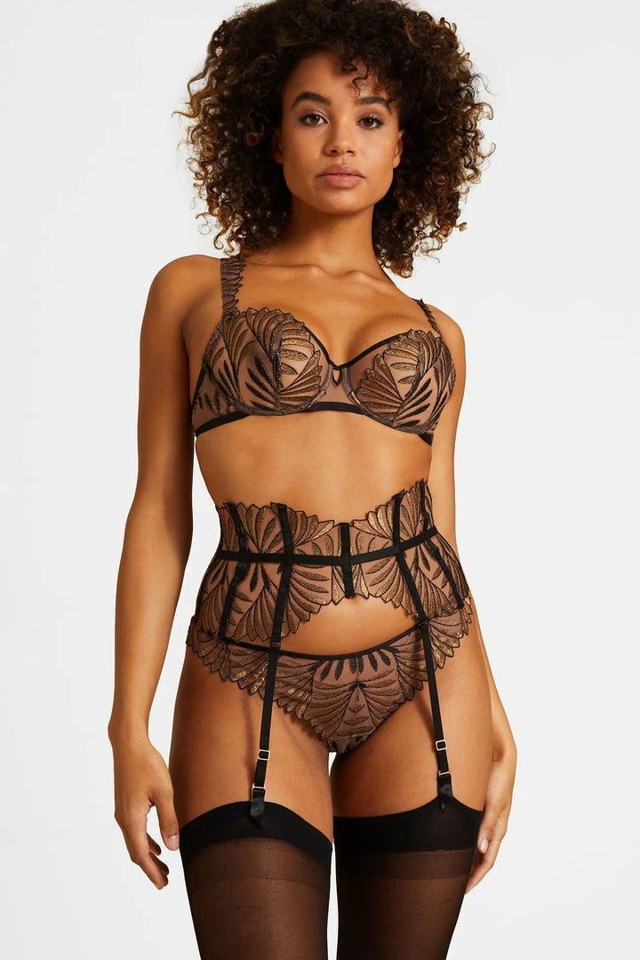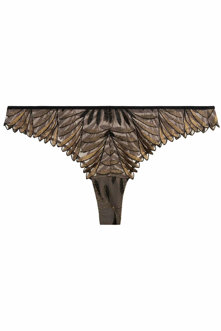 The Sensory Illusion Tanga subtly reveal bare skin with a glamorous look. The luxurious embroidery features a gradated black with bronze highlights for a bright, chic look. It has a sexy, high-cut shape in Swiss embroidery to show off your captivating curves.