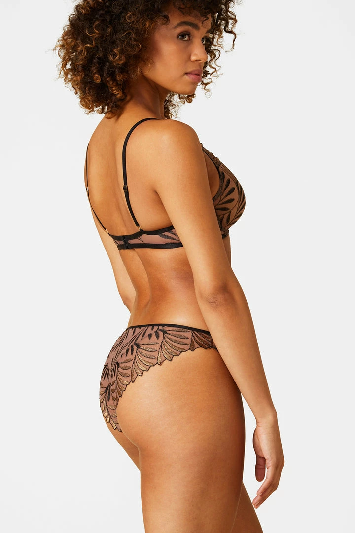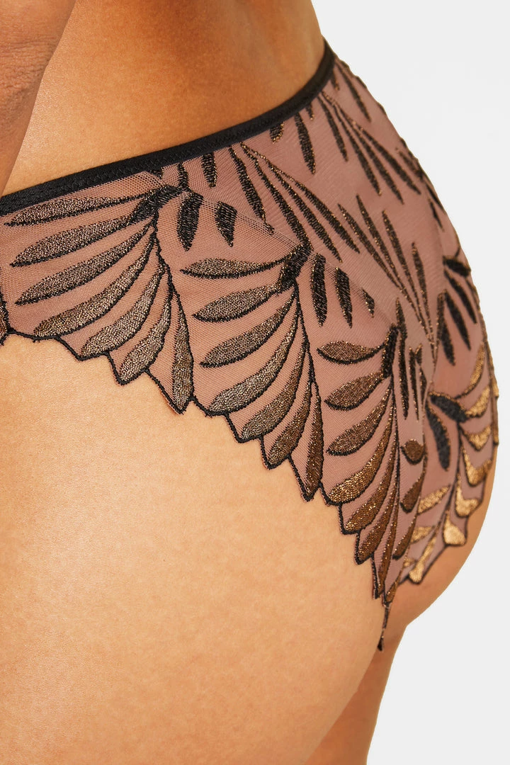 The Sensory Illusion Italian brief drapes the body with delicate embroidery in a gradated black with bronze for a bright, chic look. The ultimate in glamour, it is extremely sensual. Its timeless cut offers medium coverage to let the imagination run as wild as your fantasies.