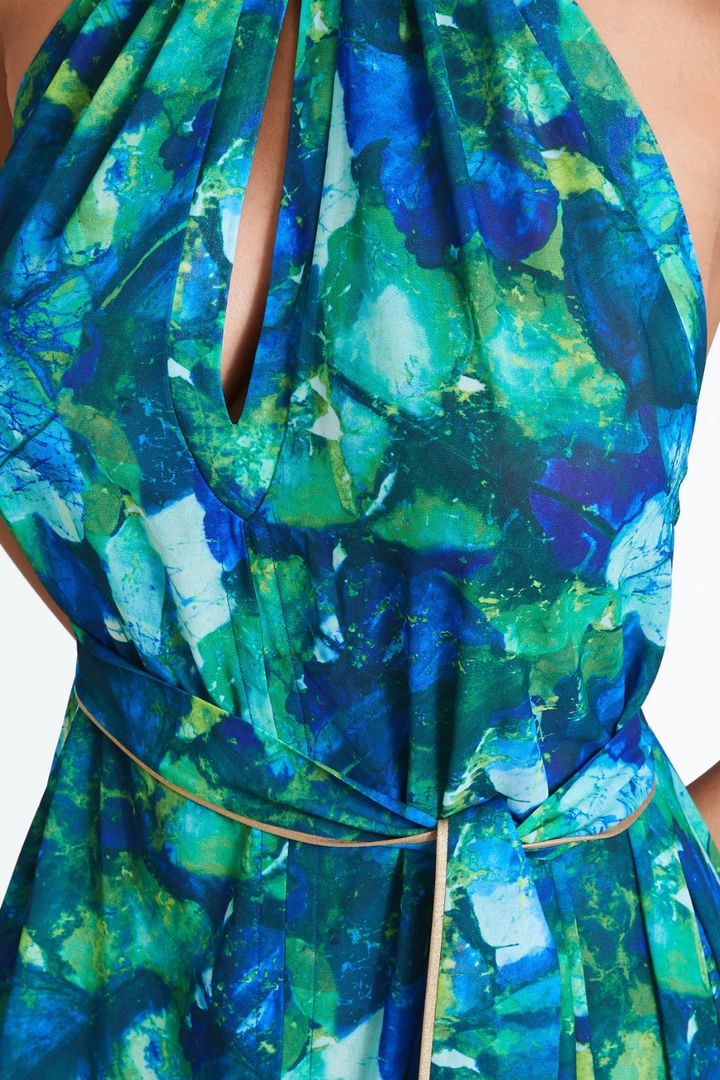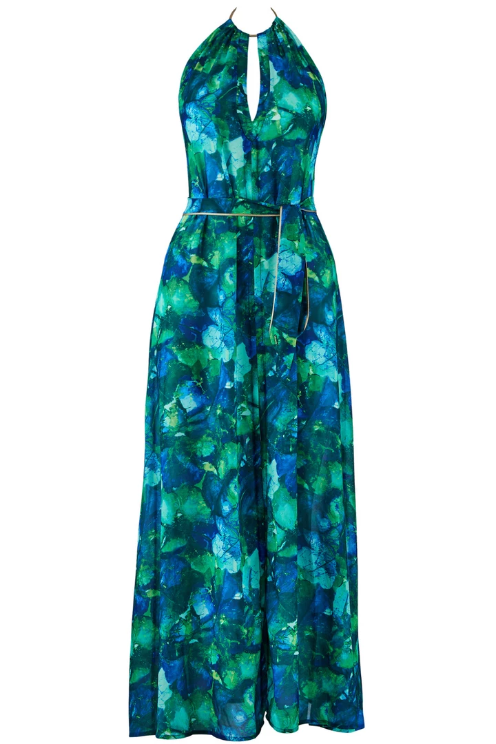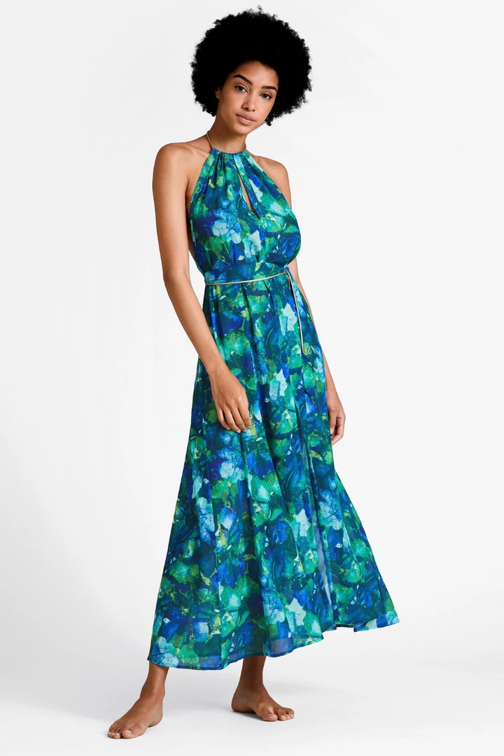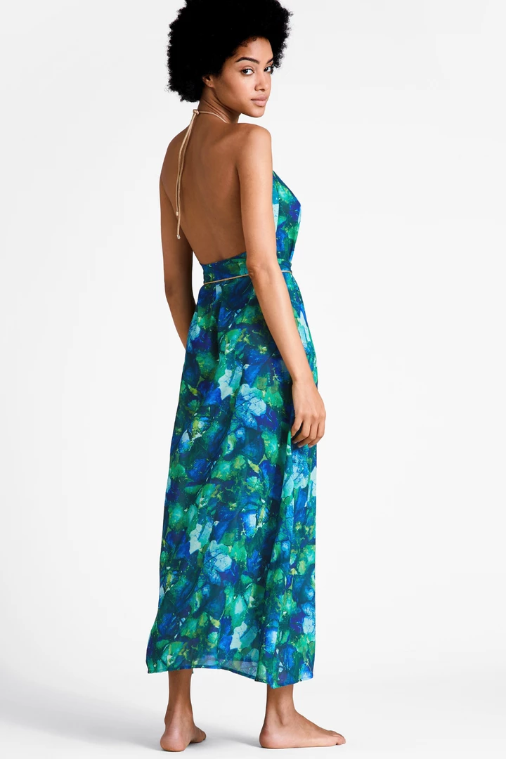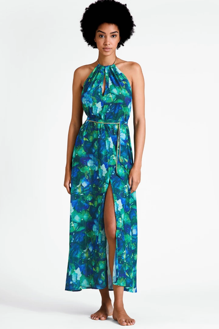 This elegant beach dress is perfect for days at the beach or by the pool. Both supple and sexy, its printed polyester veil goes perfectly with this season’s swimwear sets. A vertiginous bare back and side spilt makes for easy wear on hot summer days. Small golden details and a removable belt complete the look.