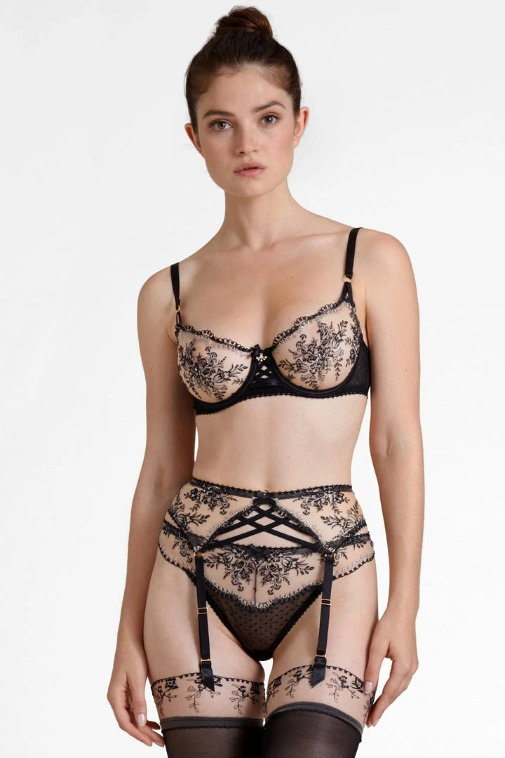 The stunning Underwired Half-Cup bra from the Tresor Infini collection features luxurious floral embroidery, enhanced with graphic scalloping and finished with a delicate, glittering lurex thread. Extraordinarily refined, it enhances the bust with barely-there tulle for a sensual look. Pair with the matching Tresor Infini Tanga and Suspender for a stunning, Parisian chic look.