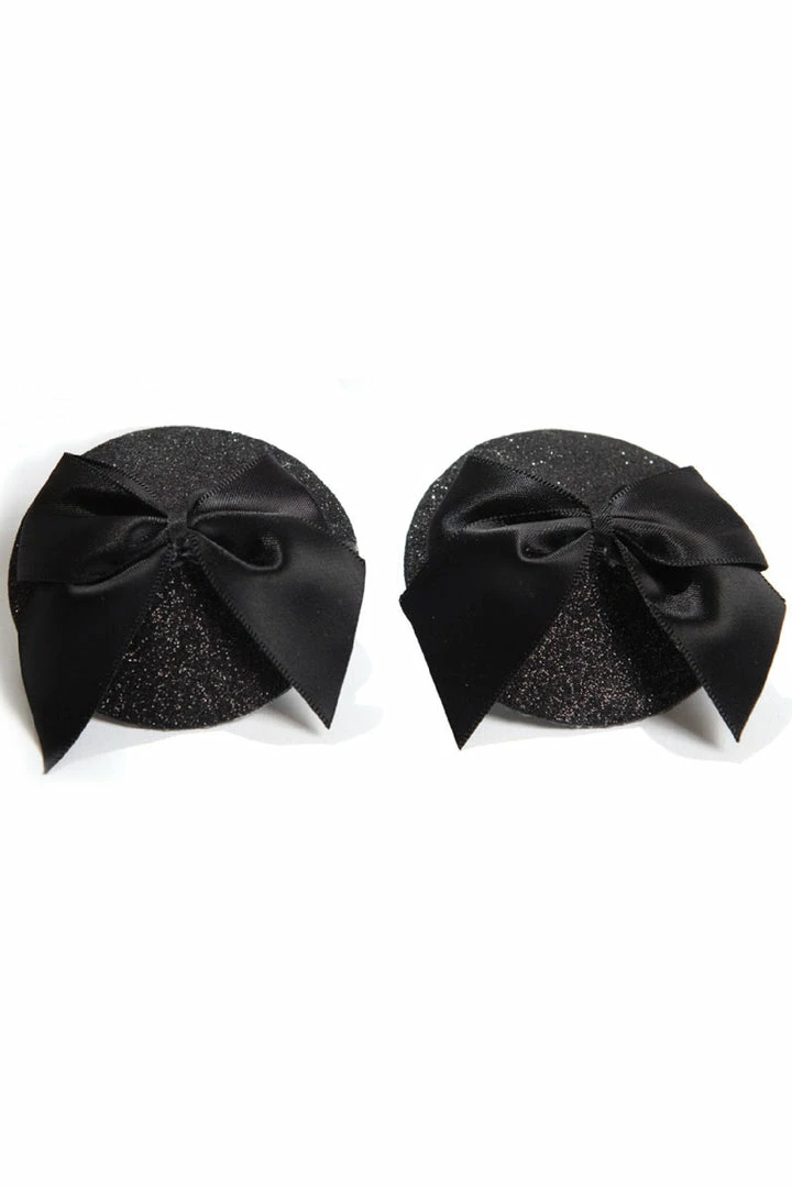 • Glitter nipple covers with satin bows.