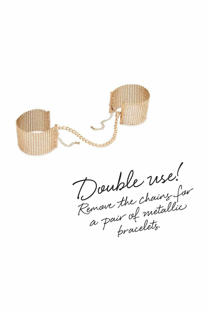 Discover alluring jewellery that invites soft bondage games with Bijoux Indiscrets ‘Désir Métallique’ line. The ‘Désir Métallique’ cuffs are designed with glistening gold mesh metal and matching accessories. The luscious gold-toned chain can be detachable for wear through the day as bracelets or as a high fashion touch to your outfit try connecting the chain to your favourite clutch. By night attach the matching Désir Métallique harness for a sexy playsuit.