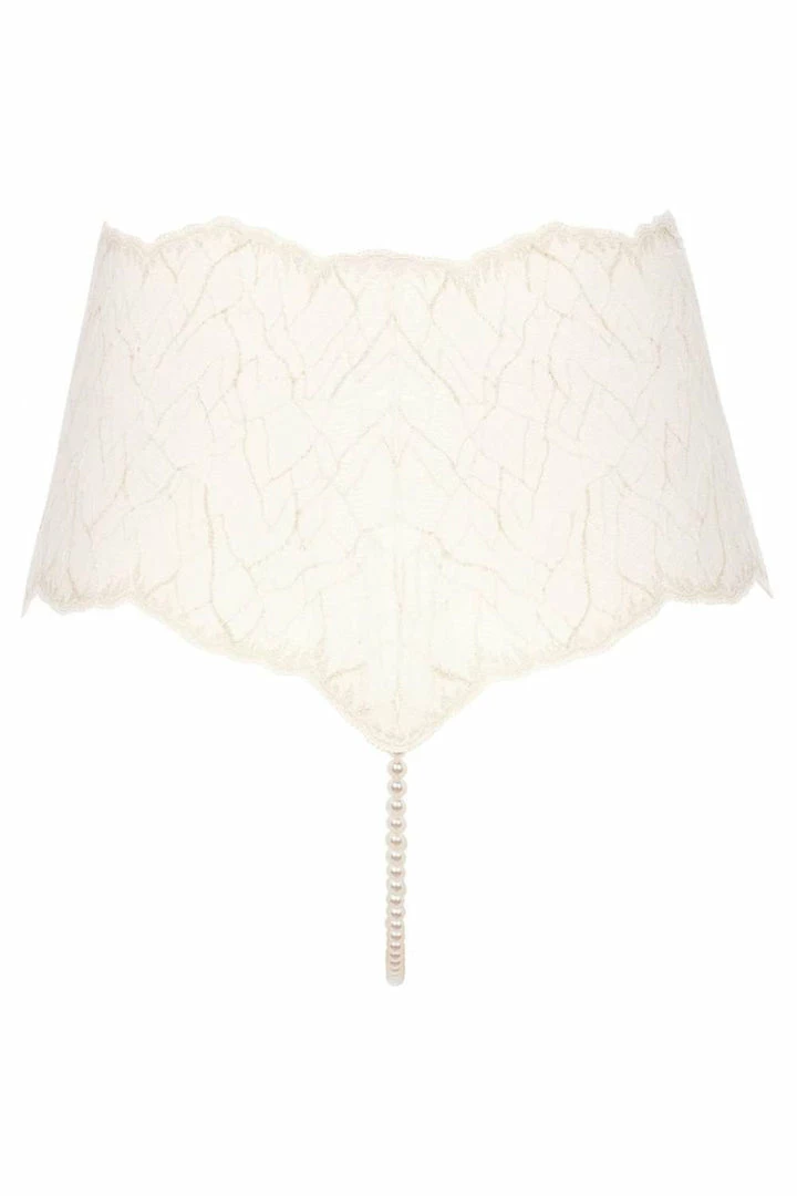 Sexy and suggestive, discover the Sydney panty, connecting luxury lingerie with jewellery, sensuality with pleasure. Made from ivory Italian lace highlighted by gold lurex it features a wide lace design for a high waisted silhouette. The cream Manacor pearls stimulate the most sensitive body parts of women thanks to a strategical collar located at the bottom of the garment, which makes it both a pleasure to wear as it is for the eyes. Style yours with one the matching Sydney bras and glove for a seductive statement.